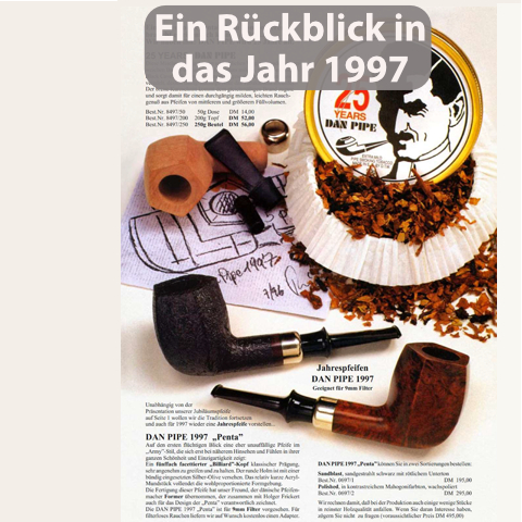 Ein fünffach facettierter Billiard-Kopf klassischer Prägung, sehr angenehm zu greifen und zu halten. Der runde Holm ist mit einer bündig eingesetzten Olive versehen. Die wohlproportionierte Formgebung vollendet das relativ kurze Acrylmundstück. Die Fertigung dieser Pfeife basiert auf den dänischen Pfeifenmacher Former. Erhältlich ist die Dan Pipe 1997 „Penta“ Relaunch in drei verschiedenen Ausführungen.